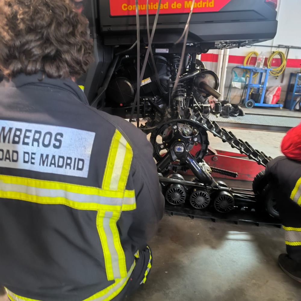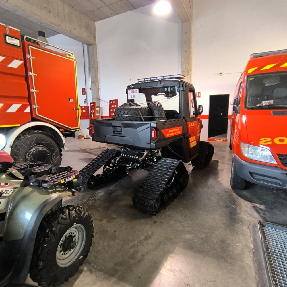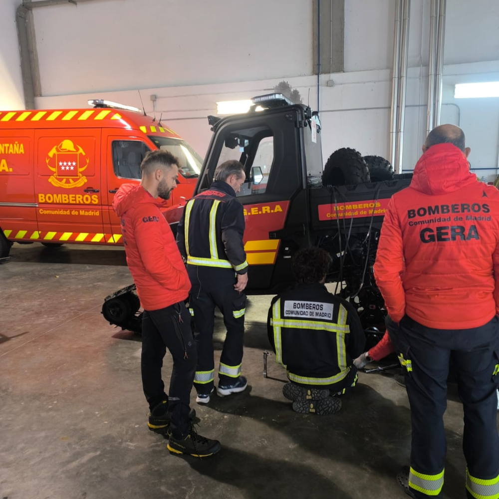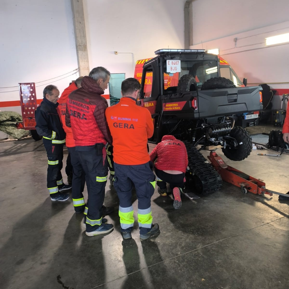 Además, el vehículo permite una rápida adaptación al terreno gracias al cambio entre ruedas y sistema de orugas Polaris. Esta versatilidad permite configurar el vehículo según el entorno: mantener las ruedas para pistas y terrenos firmes, o montar las orugas cuando las condiciones se vuelven especialmente complicadas, como nieve profunda, barro o superficies muy blandas. Durante la formación se explicó el proceso de montaje, ajuste y uso correcto de este sistema para garantizar su rendimiento y seguridad en intervención.
