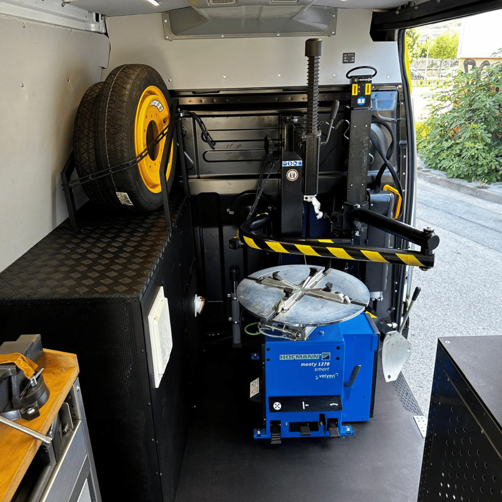 Intervención rápida y profesional: Equipado con desmontadora, equilibradora y sistema neumático para realizar el servicio completo sin necesidad de trasladar el vehículo afectado.