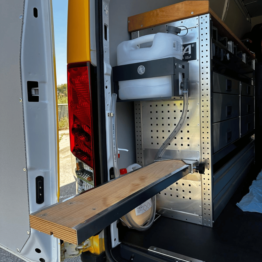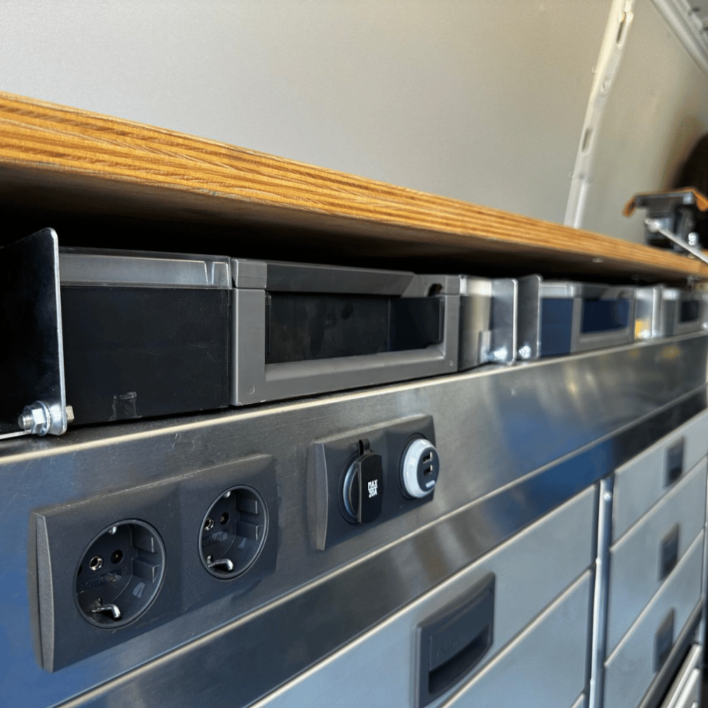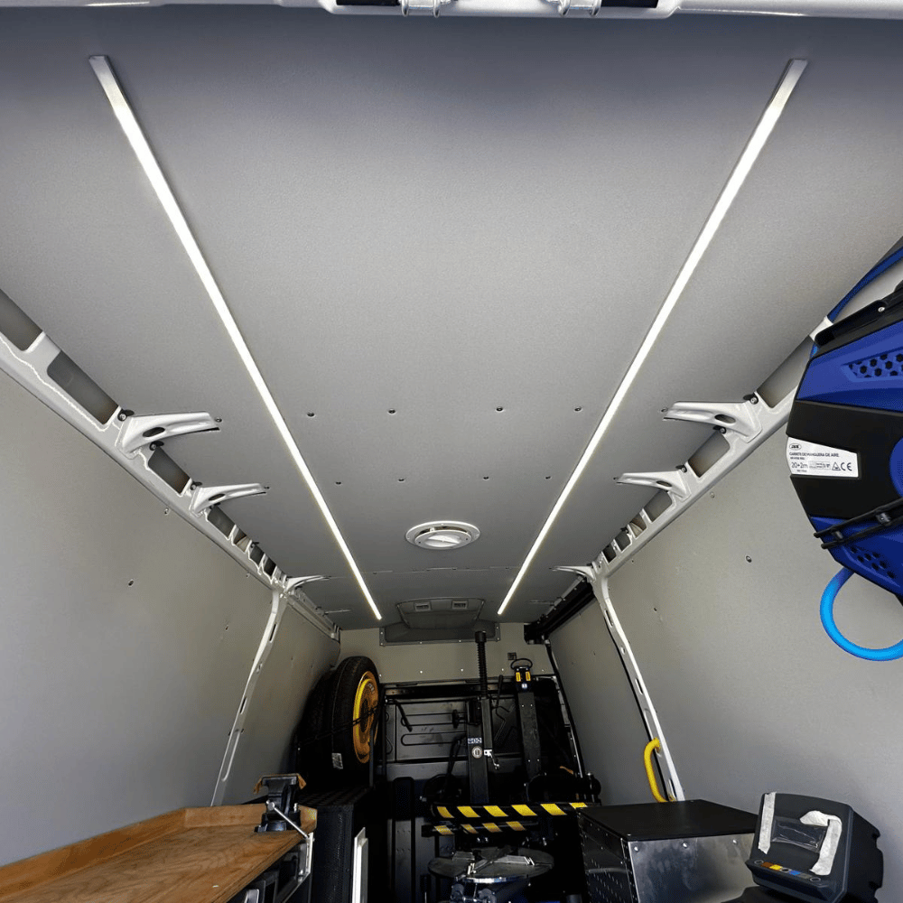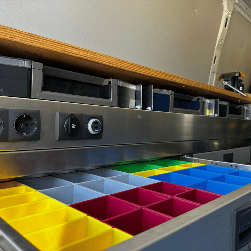 • Organización y seguridad: Sistemas modulares de almacenamiento con bloqueo antiapertura, diseñados para mantener el material seguro durante la conducción.