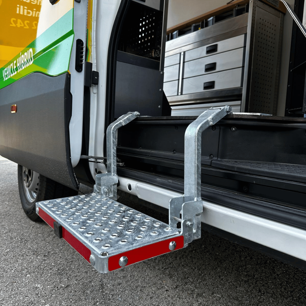 • Peldaño abatible trasero para facilitar el acceso al interior del taller móvil.